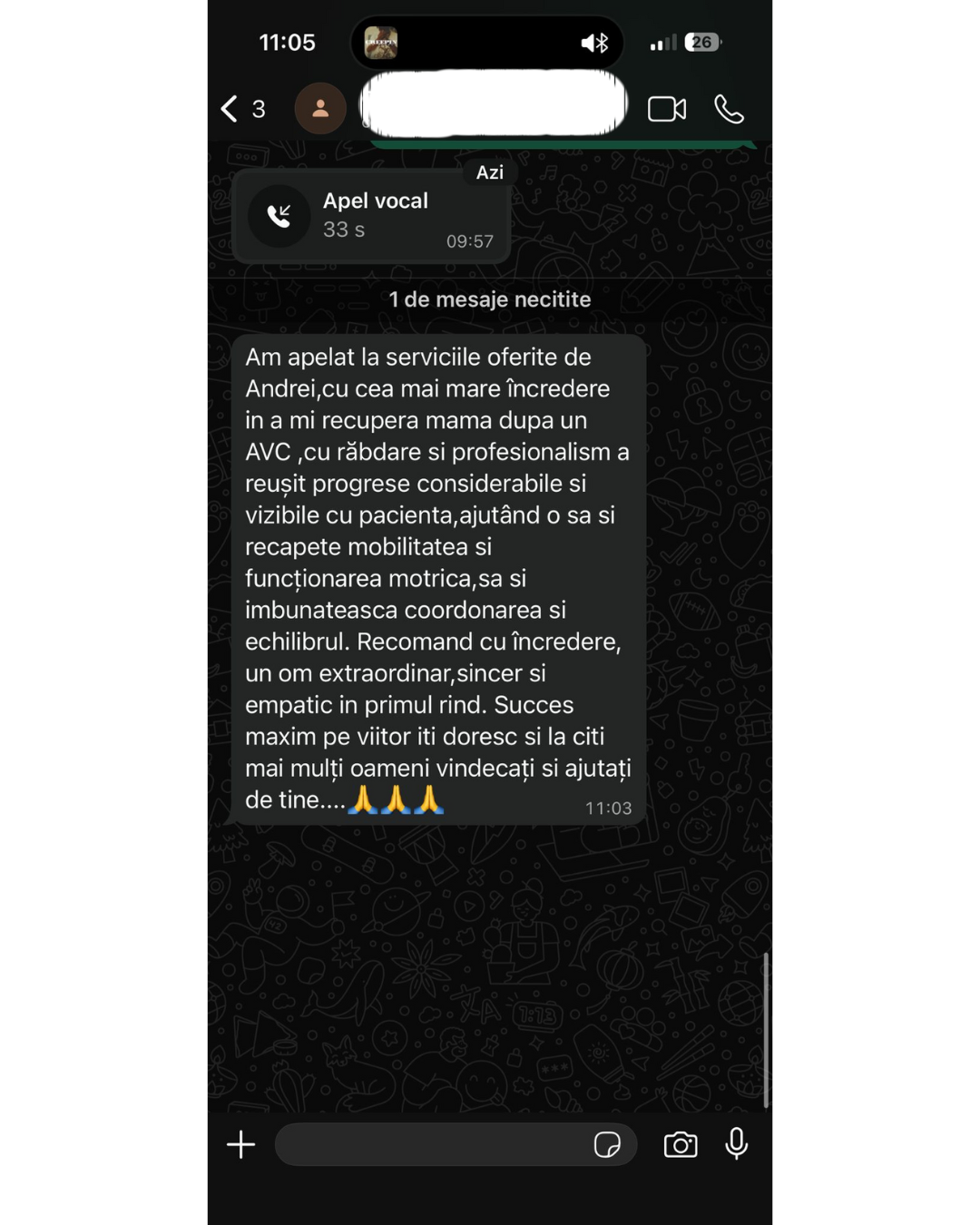 Am apelat la serviciile oferite de Andrei, cu cea mai mare încredere în a-mi recupera mama dupa un AVC, cu răbdare și profesionalism a reușit progrese considerabile și vizibile cu pacienta, ajutând-o să-și recapete mobilitatea și funcționarea motrică, să-și îmbunătățească coordonarea si echilibrul. Recomand cu încredere, un om extraordinar, sincer și empatic în primul rând. Succes maxim pe viitor îți doresc și la câți mai mulți oameni vindecați și ajutați de tine…. 🙏🙏🙏