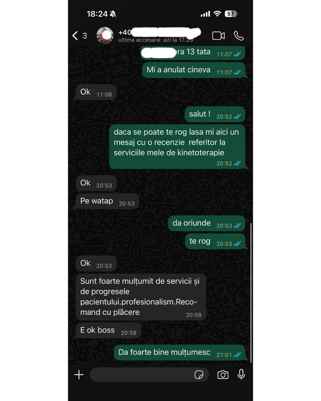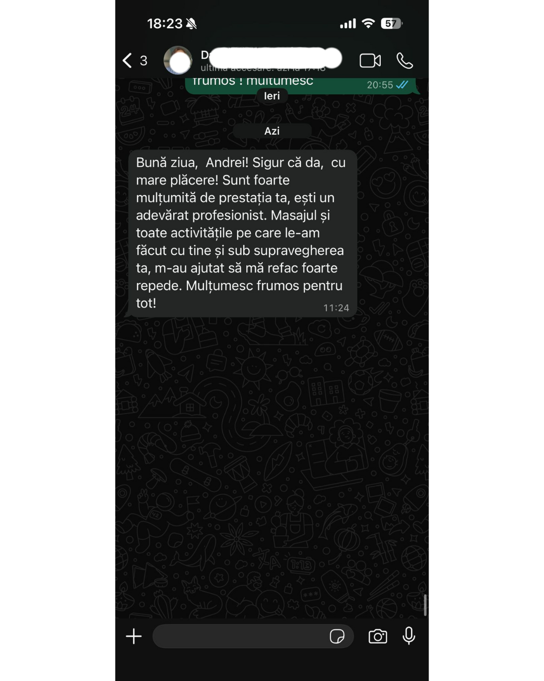 Sunt mulțumită de masaj și de rezultatele care au fost chiar după a doua ședință! Cât despre tine ești punctual și ajuți de fiecare dată când este nevoie. Te interesează starea pacientului.